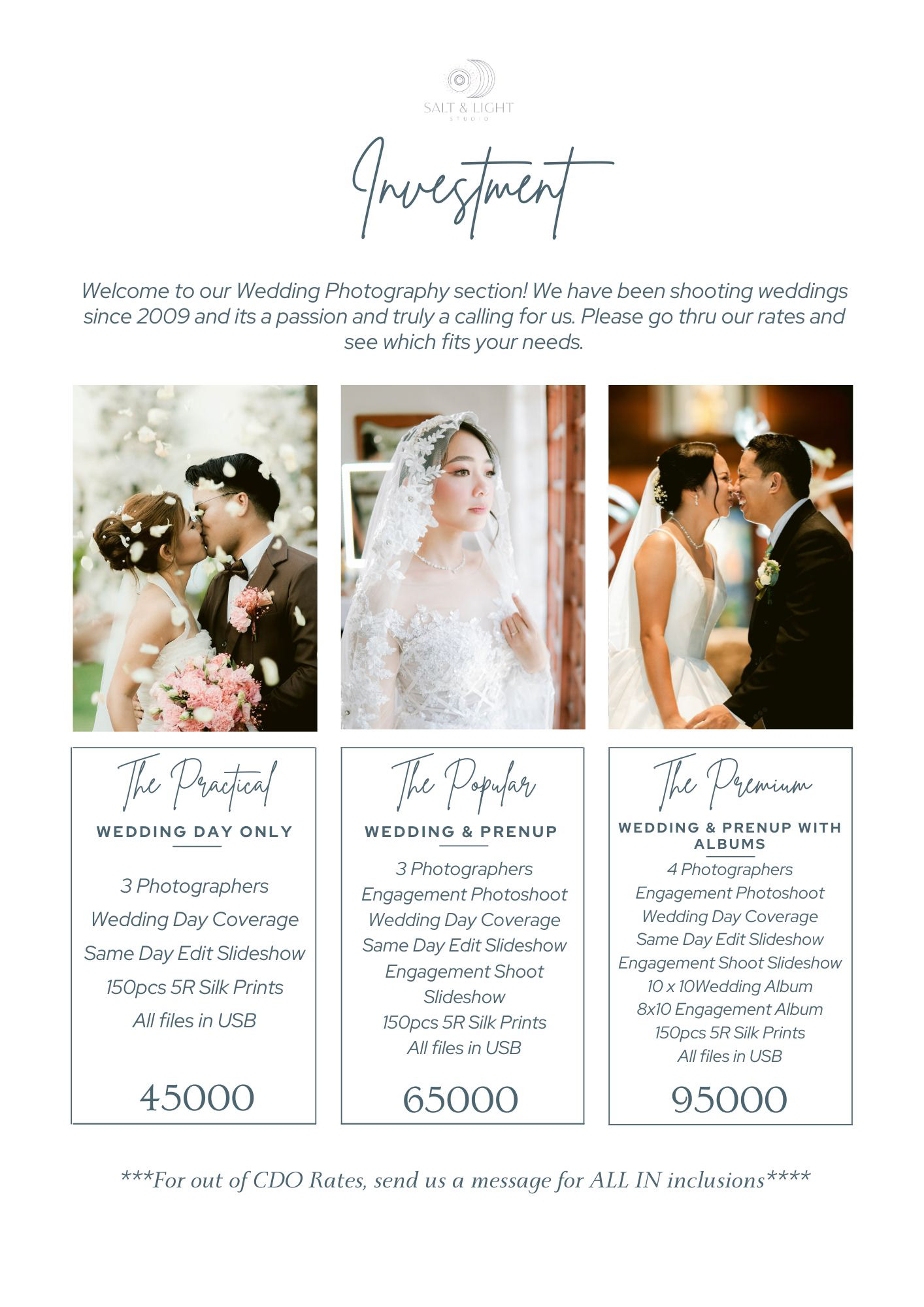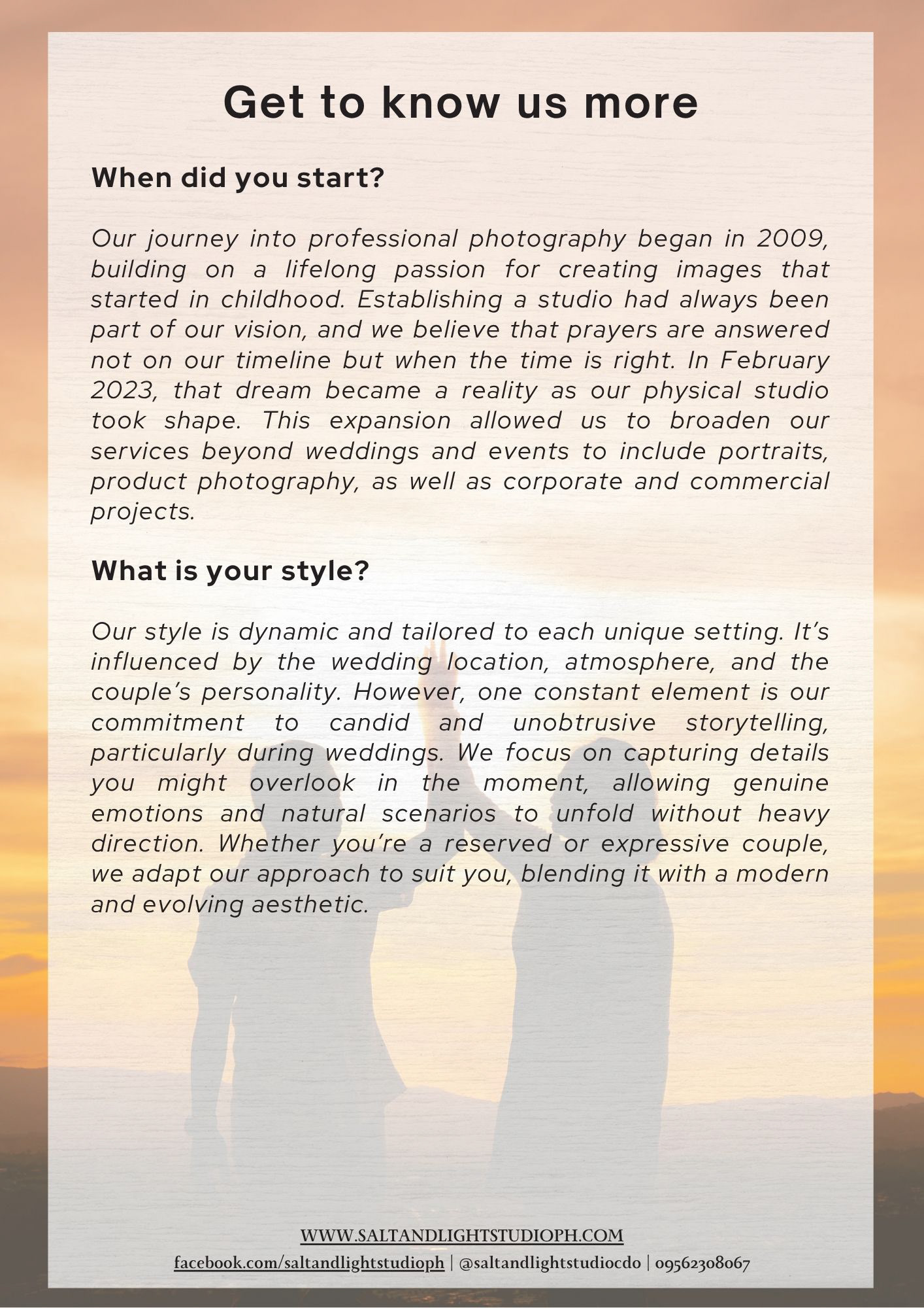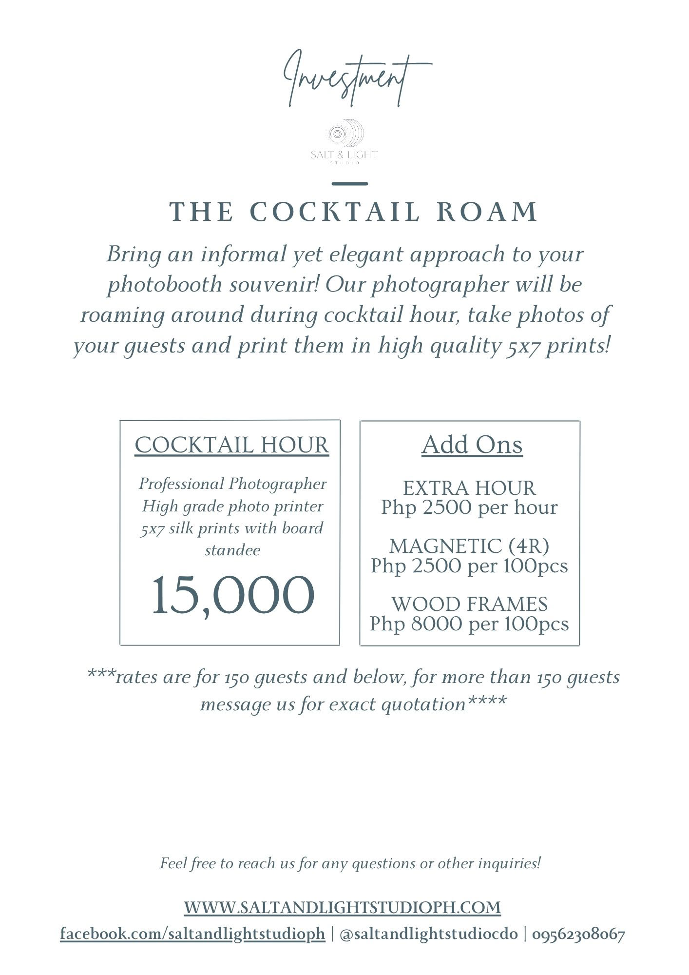 Here are our Wedding Service Sheet as well as our Studio Service Sheet, if you find something that you are interested in, send us a message!